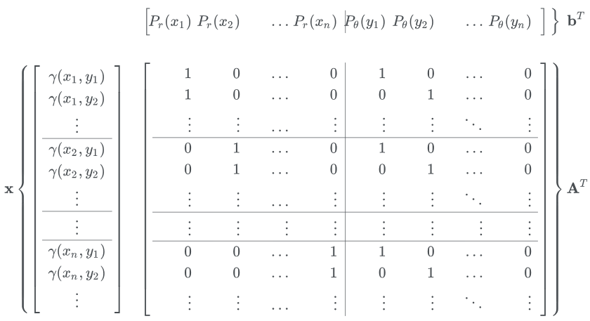 $m = 2l$이 되고, $\mathbf{A}$를 다음과 같이 정의해 constraint $\sum_x \gamma (x, y) = P_r(y), \sum_y \gamma(x, y) = P_\theta(x)$를 $\mathbf{Ax=b}$로 표현할 수 있게 된다.