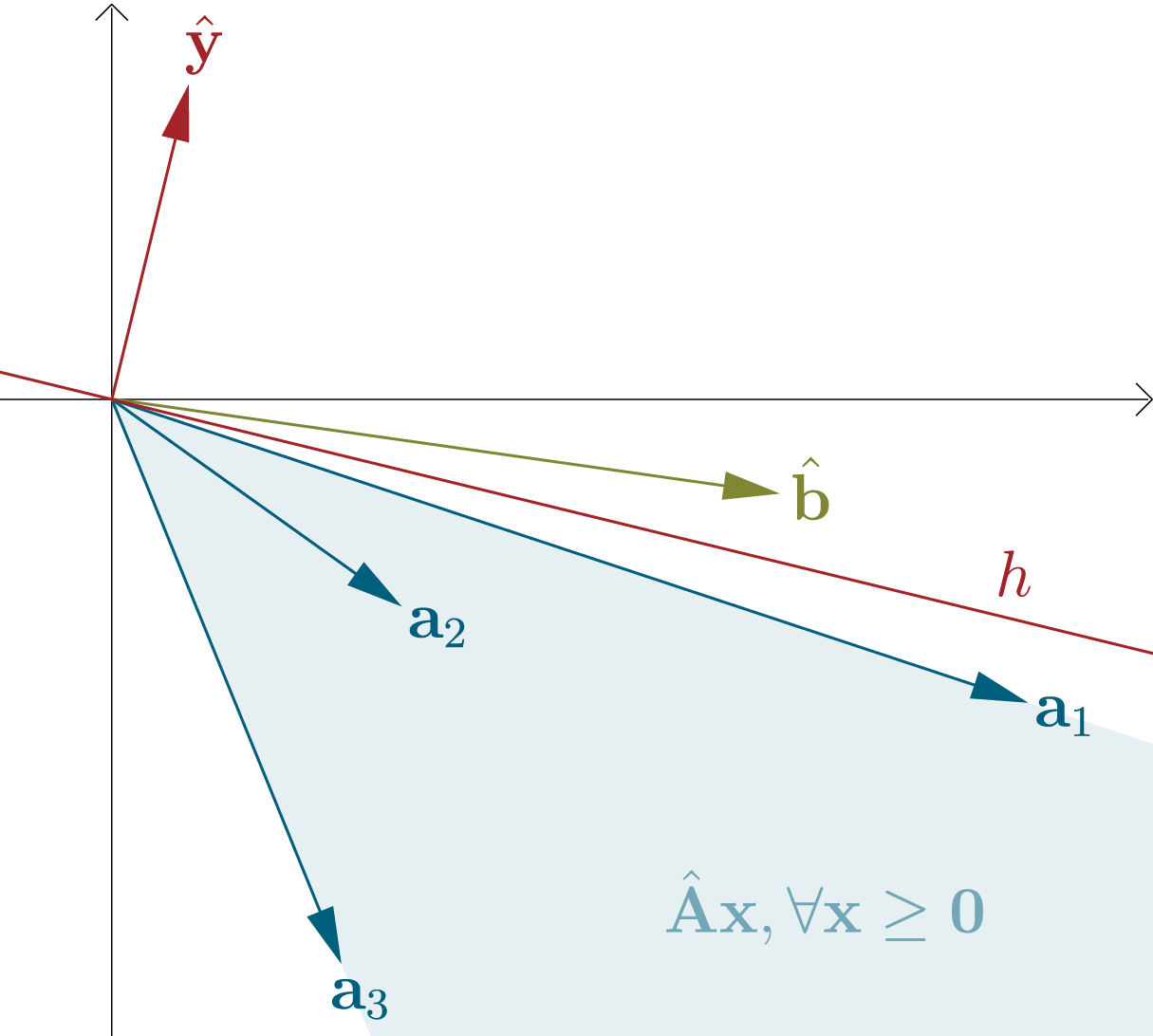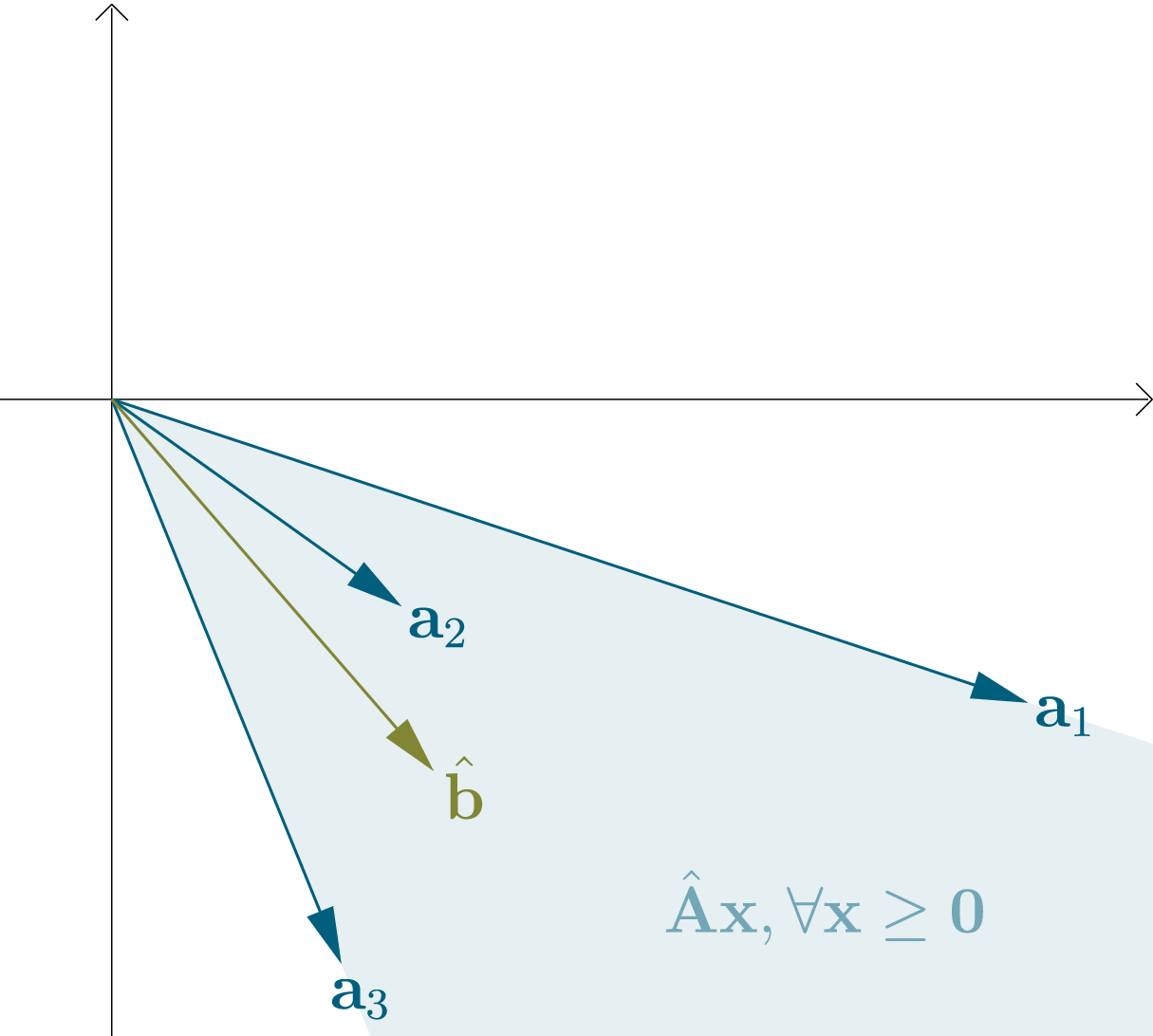 어떤 행렬 $\hat{\mathbf{A}} \in \mathbb{R}^{d \times n}$의 열들을 열벡터 $\mathbf{a}_1, \mathbf{a}_2, \dots \mathbf{a}_n \in \mathbb{R}^d$로 생각할 수 있다. 그러면 이 열벡터들과 음이아닌 계수들로 이루어진 선형조합들은 꼭짓점이 원점인 convex cone을 형성한다. 우린 이 계수들을 $\mathbf{x} \in \mathbb{R}^n_{\ge 0}$으로 표현할 수 있다.