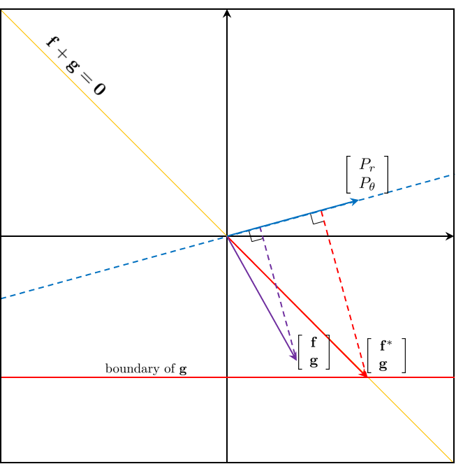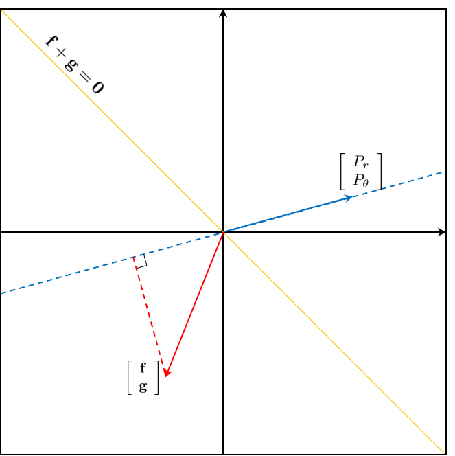 $\left [ \begin{array}{c} P_r \\ P_\theta \end{array} \right ], \left [ \begin{array}{c} \mathbf{f} \\ \mathbf{g} \end{array} \right ]$를 좌표상의 벡터로 나타낼 수 있다.