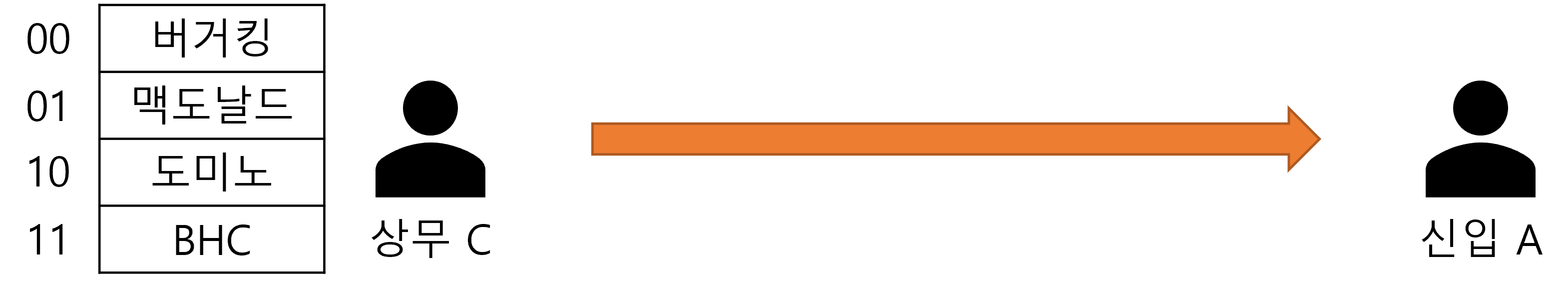 이번엔 상무 C와 같이 회식을 할 일이 생겼다. 상무 C는 메뉴가 아니라 브랜드까지 맞춰야 한다. 회식을 100만 번 한다고 했을 때, 상무 C를 최대한 감동시키려면 평균 질문을 몇 번 해야 할까? 답은 2번이다. 위 그림과 같이 각 브랜드에 $\{00, 01, 10, 11\}$을 인코딩 해주면 질문을 "1. 혹시 앞자리가 $0$이세요? 2. 뒷자리가 $0$이세요?"의 두 개만 하면 되기 때문이다. 따라서 상무 C의 메뉴 취향은 2bit의 sequence로 표현할 수 있다. 예시를 하나 더 보자.