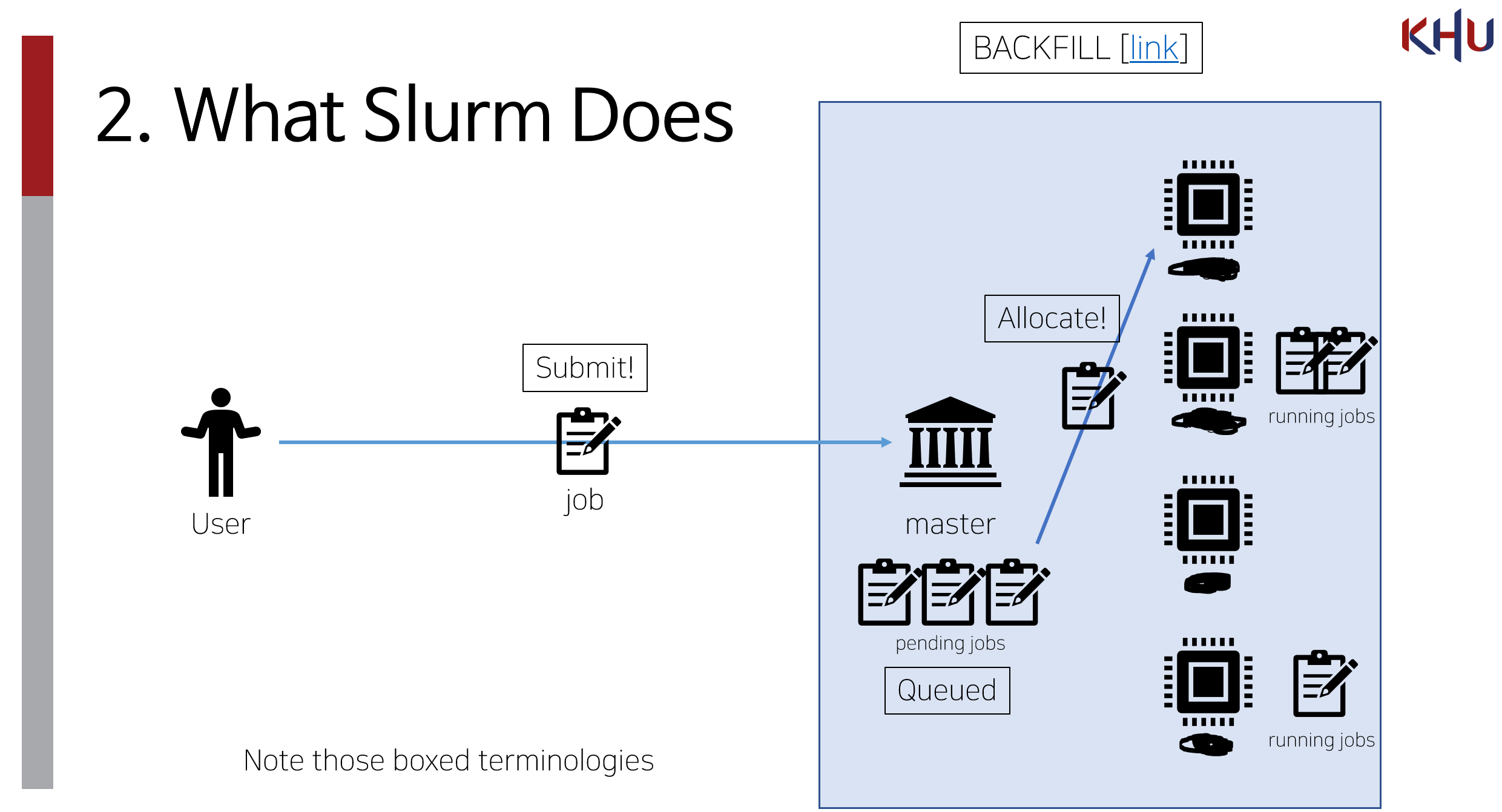 유저가 자원을 요청하면 자원을 빌려주거나, 가용한 자원이 없으면 대기시킨다. 유저는 노드들을 돌며 일일이 nvidia-smi, htop을 찍어보면서 어느 GPU가 비었나 확인하지 않아도 되고, job을 돌려놓고 누가 내 GPU를 사용해 OOM이 뜨지 않을까 노심초사하지 않아도 된다. 또, 다른 사람이 자원을 쓰고 있을 때 수시로 nvidia-smi를 찍어보며 기다리지 않아도 된다.