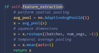 average_clips='prob': softmax를 통과한 확률값이 담긴다. Shape은 (# test set, # classes)이다.average_clips='score': logit이 담긴다. Shape은 똑같다.feature_extraction=True: Backbone을 통과한 feature를 뽑는다. GAP → consensus까지만 통과한 feature가 들어있고, 앞의 옵션들보다 우선순위가 높다.